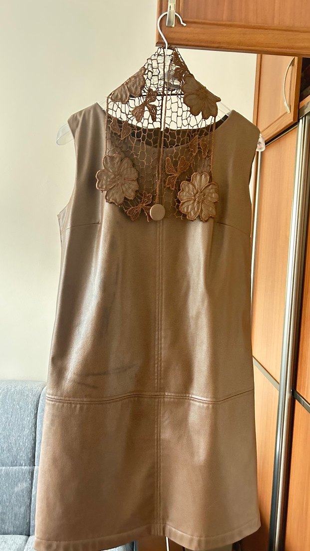 Kolsuz, yakalı bej deri elbise, dantel nakış detaylarıyla vintage bohem tarzı sunar. Uyumlu ve kısa kesimdir. ürün batık Marcka deri görünümlü suni deri elbise üzerinde dantel detaylı deriden yakası kendinden çıkabilen bir yakası var ürün boyu 86 santim arkadaki fermuar uzunluğu 34 santim iki koltuk arası 47 santim defosu sadece üzerine dolapta beklerken siyah elnise rengi solmuş kullanılmayan engel değil içi astarlı çok hoş bir elbise çok beğenerek almıştım ama kilo aldığım için bana olmuyor umarım alıcısına çok yakışır başka hiçbir defosu yok yırtık sökük vs üzerindeki sol olanları belirttim  çıkabilen dantel detaylı yaka 70 cm