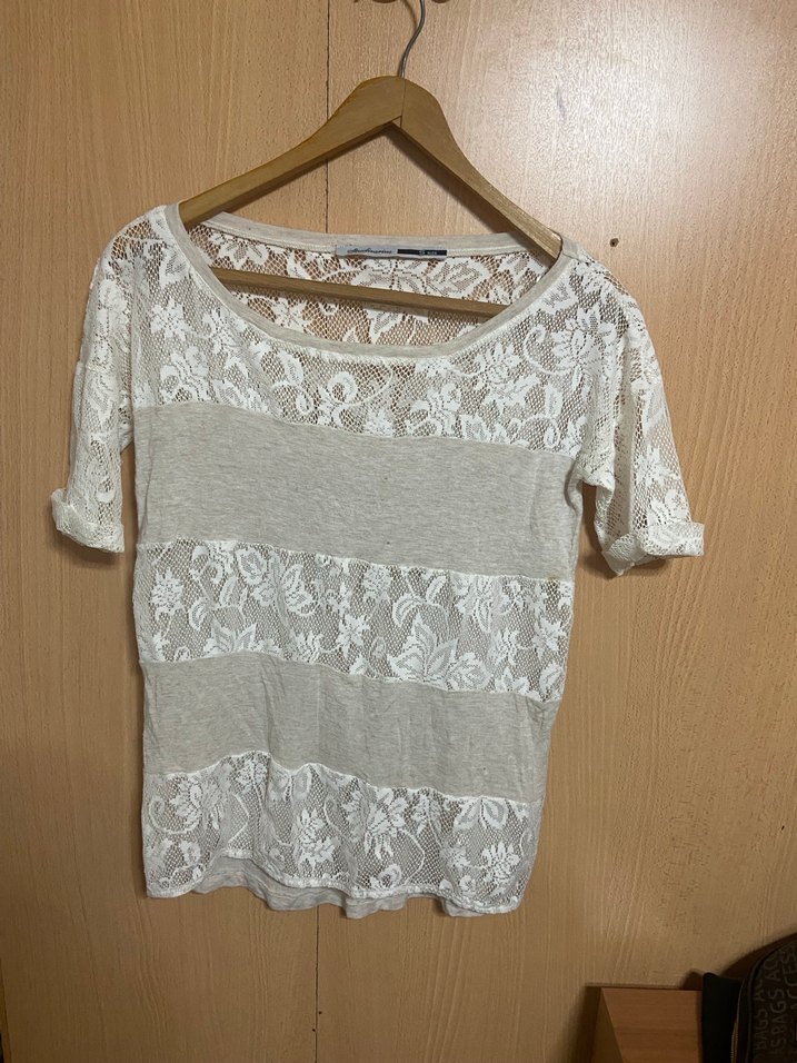 Bej renkli kadın bluz, dantel detaylı ve kısa kolludur. Yumuşak triko kumaştan, salaş kesim ve tekne yaka ile günlük kullanıma uygundur. Etiketi yok hiç giyilmedi