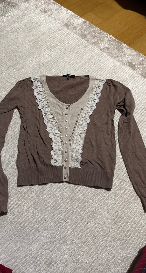 Bej renkli, uzun kollu, dantel detaylı örme kadın hırka. Düğmeli ve vücuda oturan kesime sahip, günlük kullanıma uygundur.