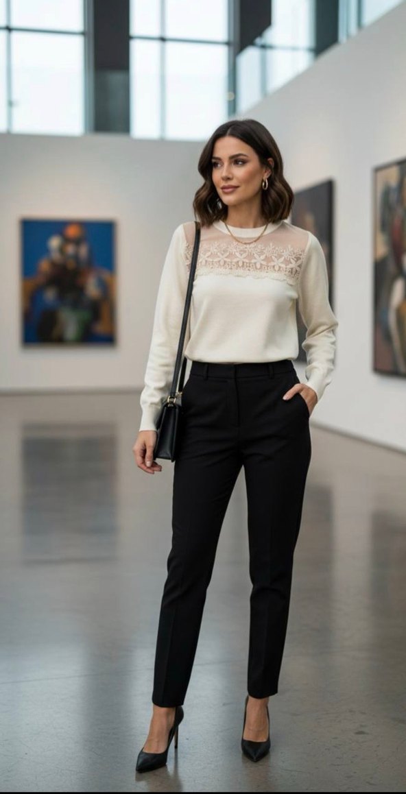 Bej renkte, dantel detaylı, yuvarlak yakalı ve uzun kollu triko. Ofis kullanımı için uygun, normal kesim ve midi boyda.