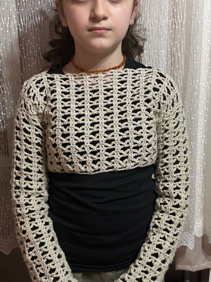 Bej renkli, dantel detaylı, uzun kollu ve kayık yaka triko kazak. Rahat kesimi ve sade tarzıyla günlük kullanıma uygundur.