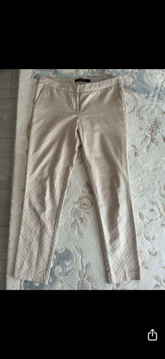 Bej keten kumaştan, dantel detaylı, normal boy midi uzunlukta, rahat kesim kadın pantolonu. Ofis ve sokak stili için uygundur.
