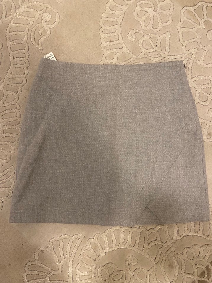 Bej keten mini etek, dantel detaylı ve normal kesimlidir. Minimalist tarzda, ofis kullanımı için uygundur. Small / 36 bedene uygundur.