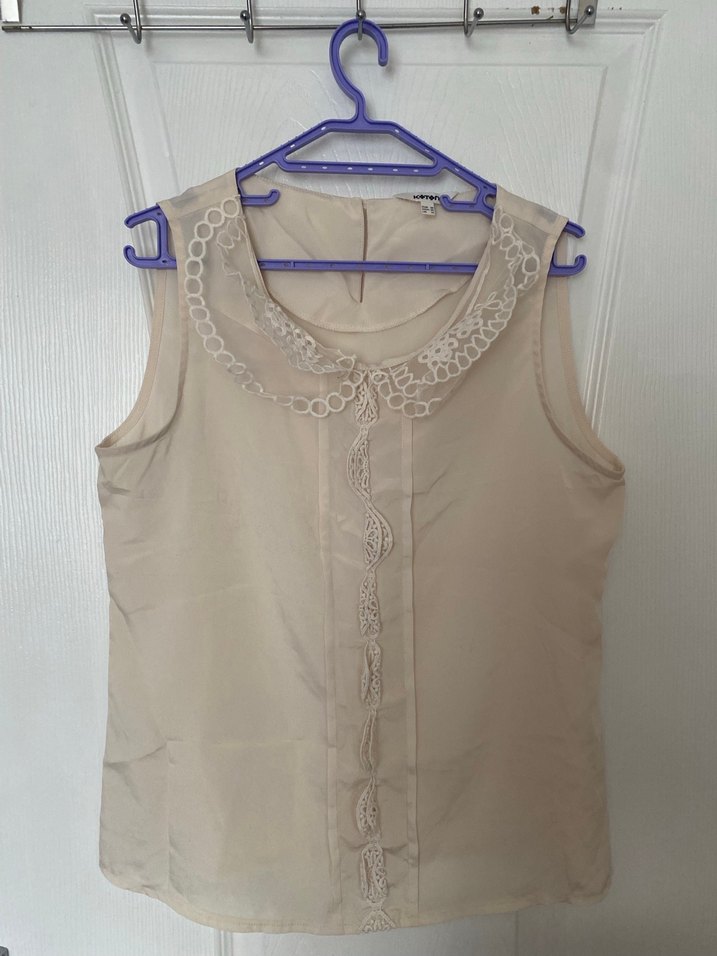 Dantel detaylı yakası ve keten kumaşıyla bej renk kolsuz bluz, bol kesim ve normal boyda, vintage bohem tarzı günlük kullanıma uygun.