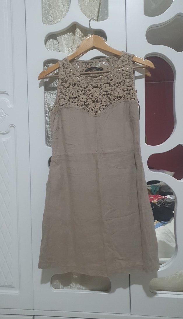 Yumuşak keten kumaştan, dantel detaylı kolsuz midi elbise. Bol kesim ve straplez yakaya sahip, bohem tarz için uygun.