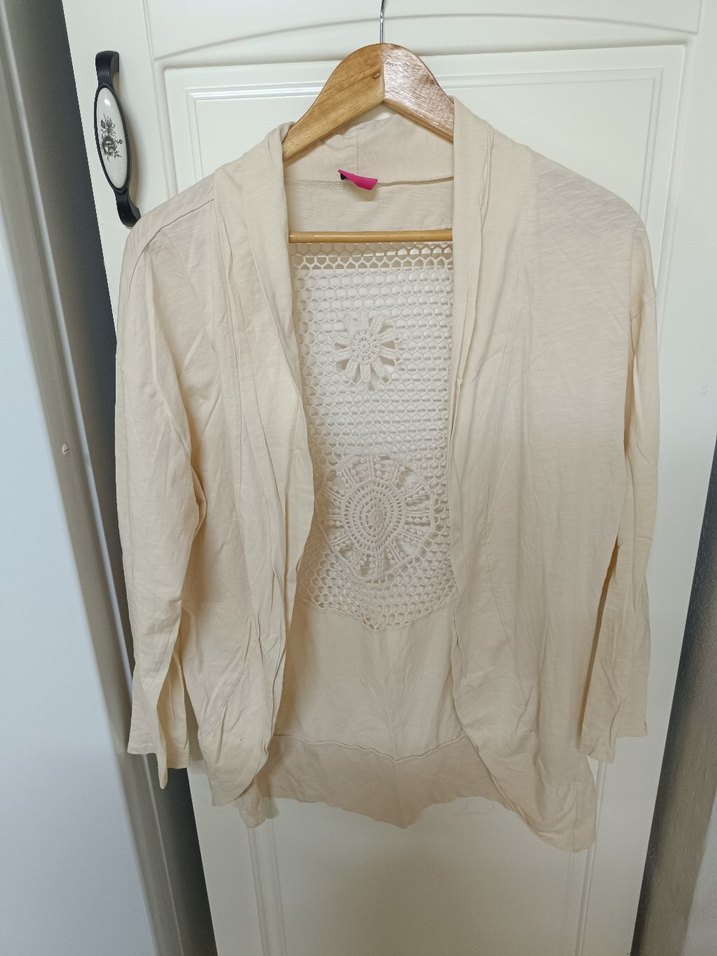Dantel detaylı, bej midi hırka. Uzun kollu, bol kesim ve yakası kesik detaylıdır. Günlük kullanıma uygun, triko kumaştan yapılmıştır.
