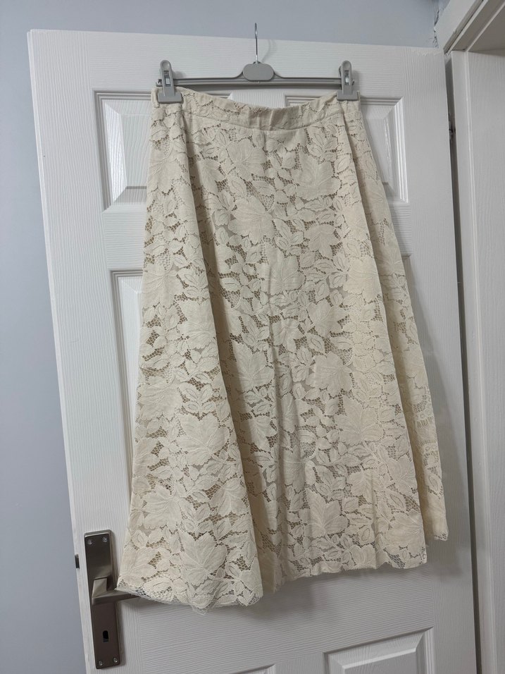 Dantel Detaylı Bej Midi Keten Etek