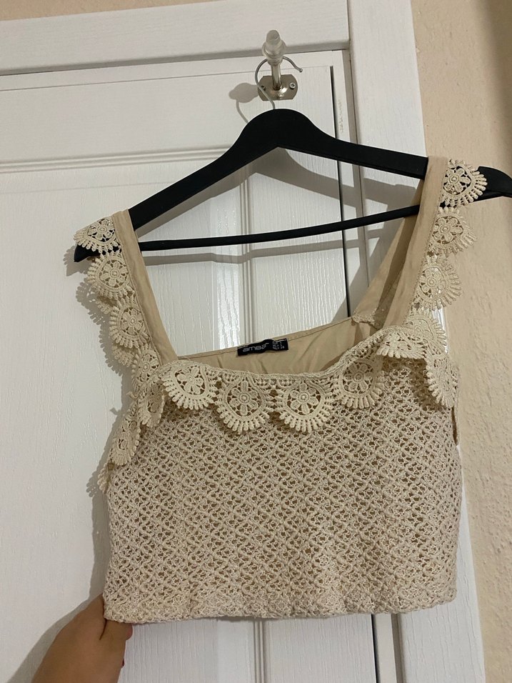 Dantel detaylı, işlemeli desenli bej renk örme bluz. Mini boy, straplez kesim ve vücuda oturan yapısıyla bohem tarzı yansıtıyor.