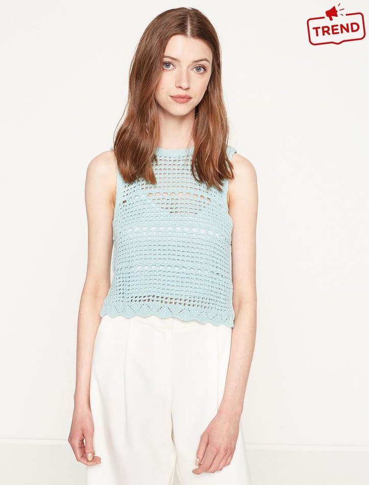Dantel detaylı, kolsuz bej triko crop top, yuvarlak yaka ve bol kesimiyle günlük kullanım için uygundur.