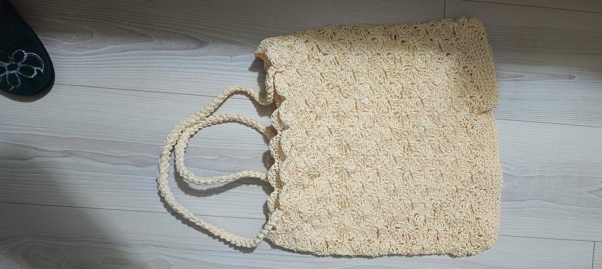 Bej renkli, işlemeli desenlere ve dantel detaylarına sahip örgü kadın çanta. Örgü saplarıyla rahat ve bohem tarz sunar. Günlük kullanıma uygundur. El yapımıdır.