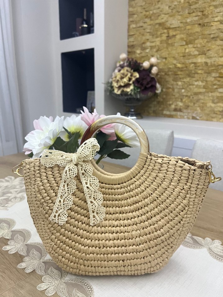 Yuvarlak saplı, dantel detaylı bej örgü kadın çanta, günlük kullanım için bohem tarzda.