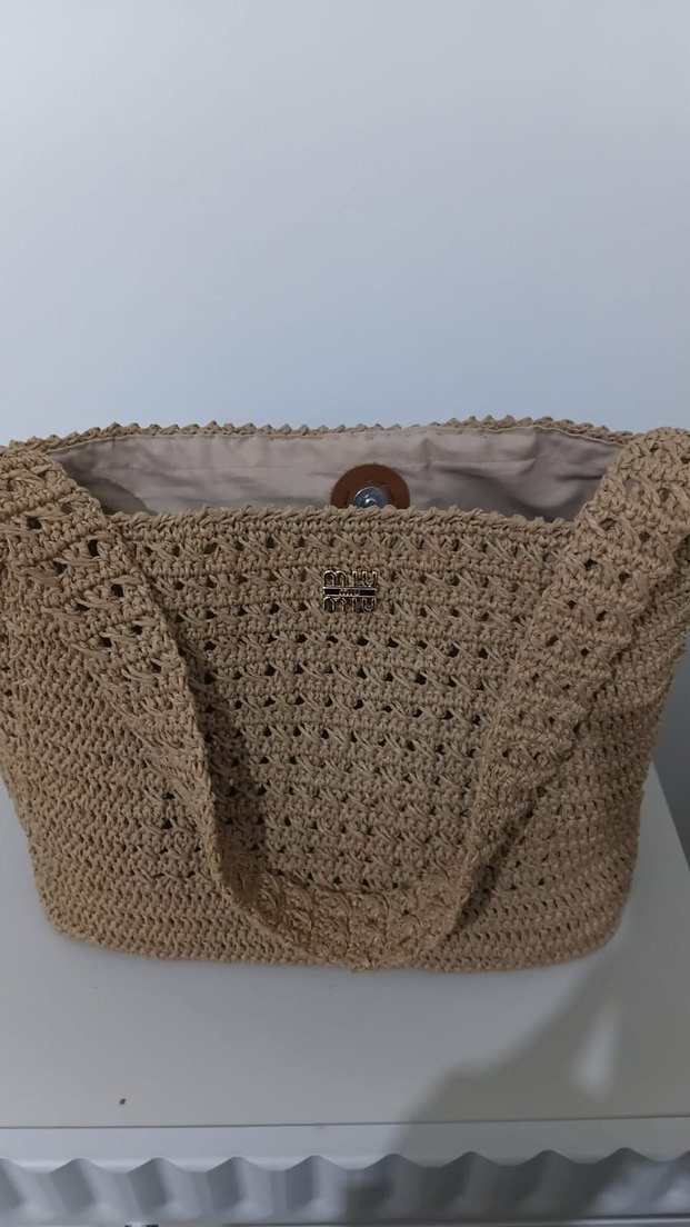 Bej renkli örgü kadın çanta, dantel detayları ve gri astarıyla bohem tarzda, günlük kullanım için uygundur.