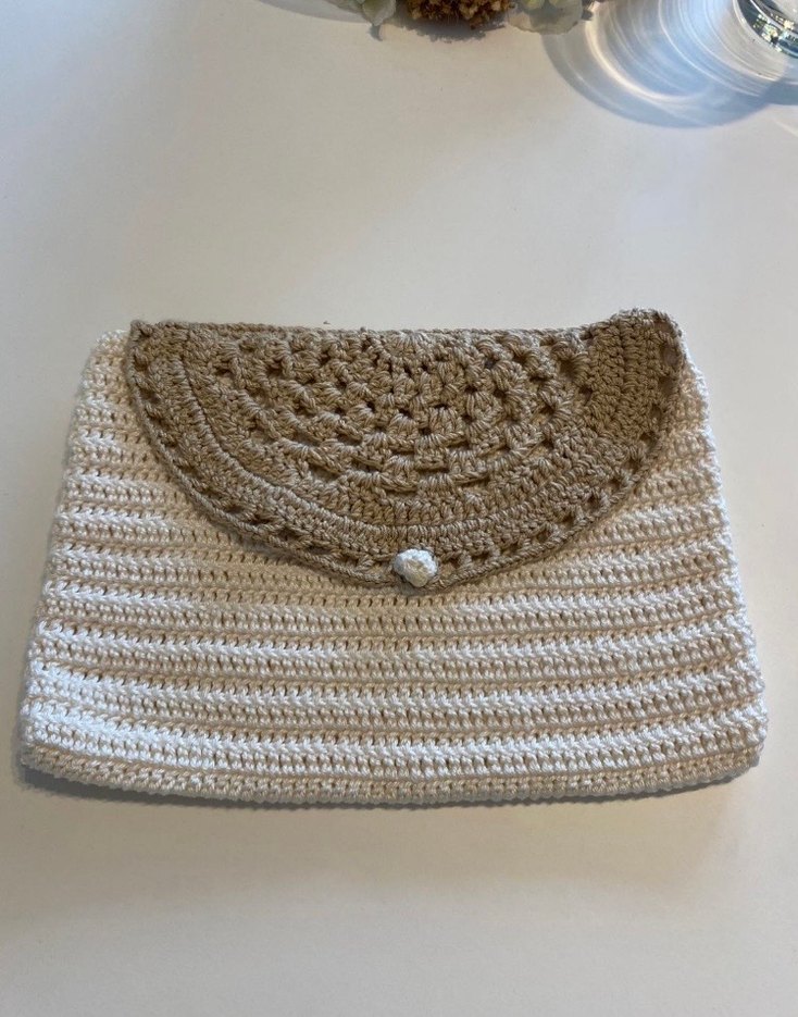Ürün sıfırdır Bej renkli, dantel detaylı örgü kadın portföy çanta, sade ve bohem tarzıyla günlük kullanıma uygundur.