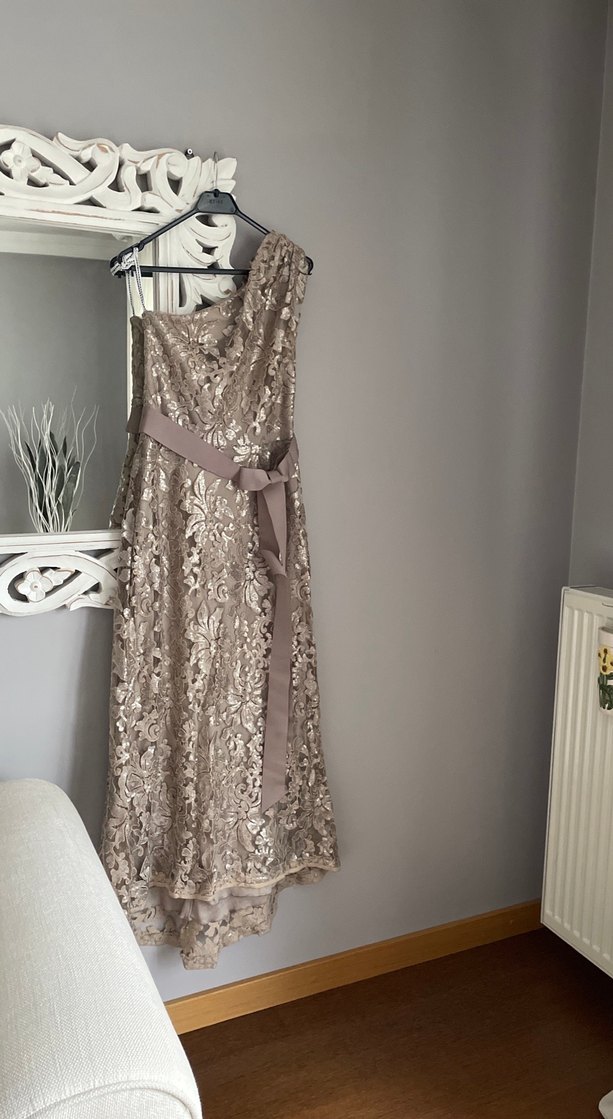 Bej renkte, dantel detaylı uzun abiye elbise. Askısız, salaş kesim ve vintage ilhamlı yılan deseni ile, belde kuşak bulunur. Düğünler için uygun.✨