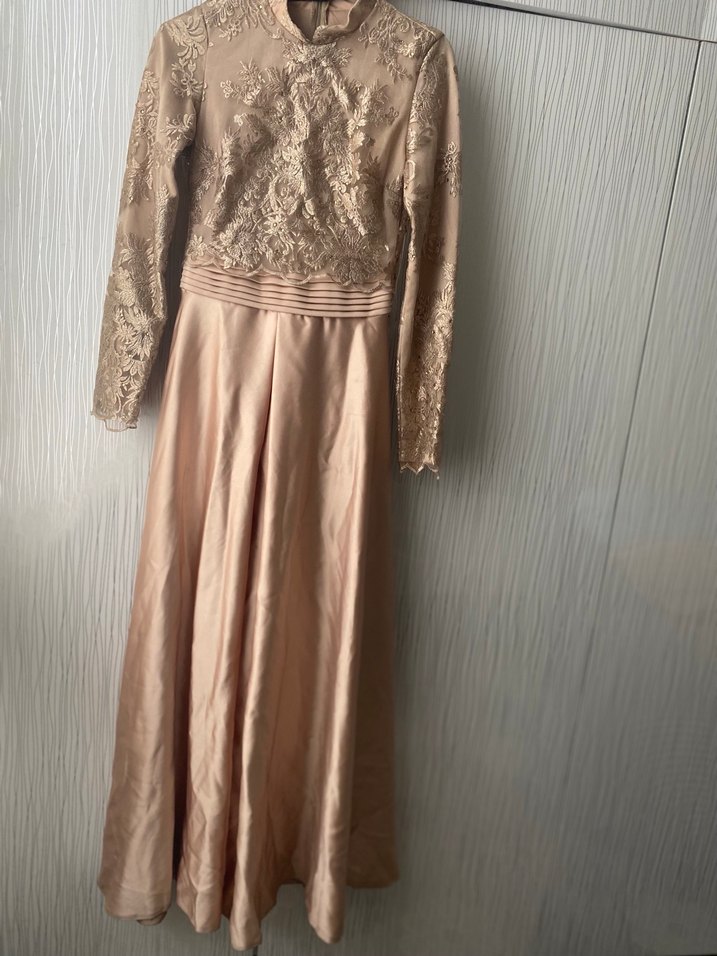Parlak bej kumaş, dantel detaylar, uzun kollu ve yüksek yakalı bu oturan uzun abiye elbise düğünler için uygundur. Eşarp dahil(eşarp tül ince).