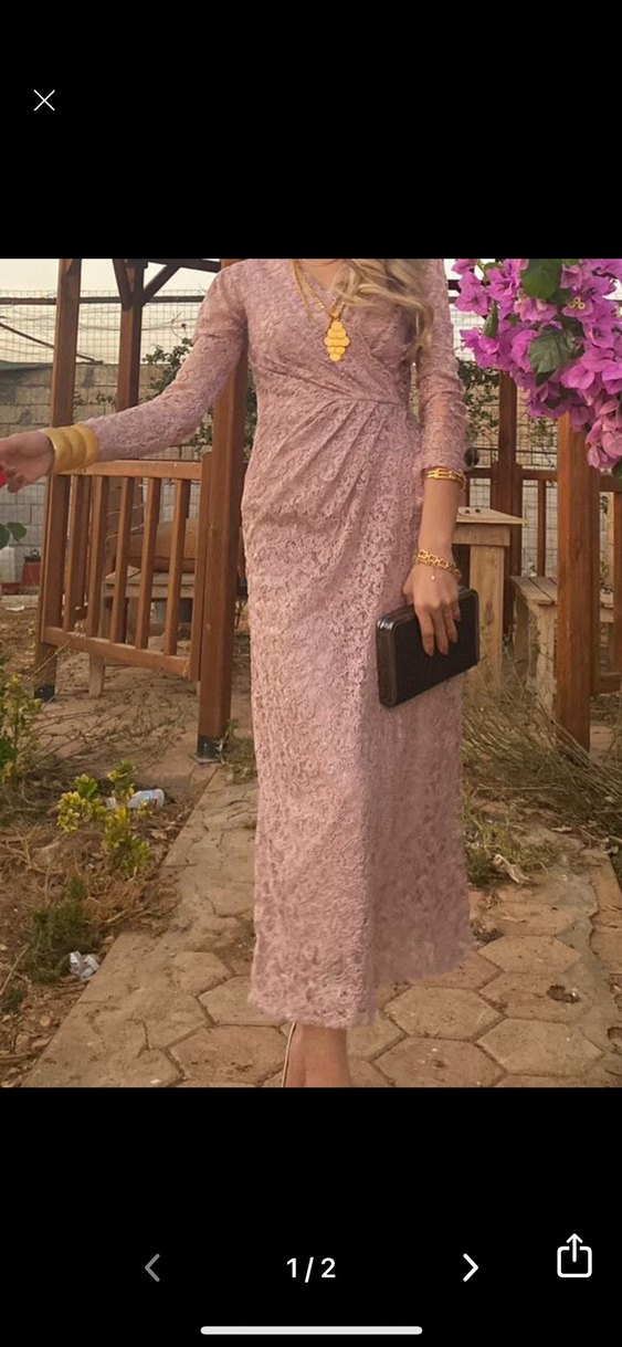 Dantel detaylı, V yakalı ve uzun kollu, toz pembe pastel renkte vintage tarzında, yılan desenli fit kesim midi abiye elbise. Düğünler için uygun.
