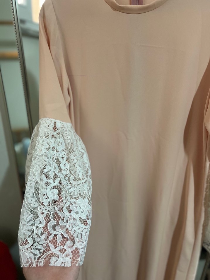 Bej renkte, uzun kollu ve dantel detaylı, salaş kesim bohem tarzda uzun elbise. Yuvarlak yakalı ve desensiz, minimalist tasarım. Pudra rengine de yakın 1 kez giyildi sorunsuz