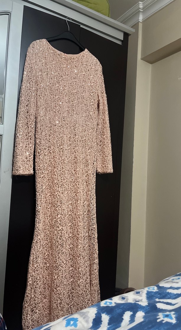Bej renkli, dantel detaylı, uzun kollu ve tekne yaka uzun kadın elbisesi. Sentetik kumaş üzerine parlak yılan desenli, bohem ve retro tarzda, düğün için uygun.