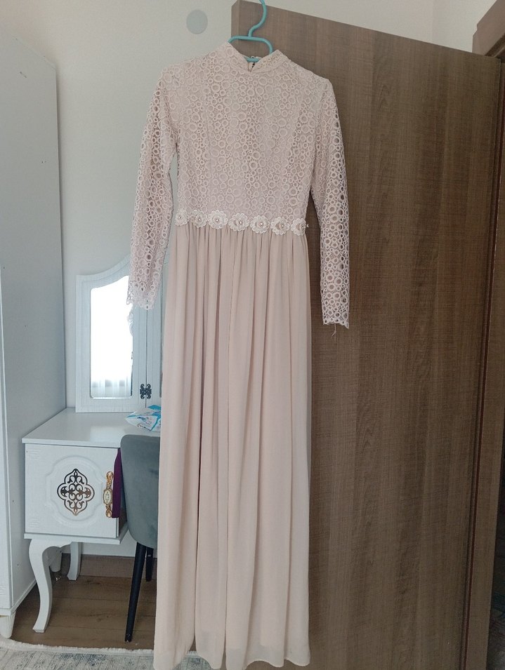 Bej renkte, dantel detaylı uzun kollu ve yüksek yakalı uzun elbise. Rahat kesimli ve modern klasik tarzıyla düğünler için uygundur. Sentetik kumaştan, pastel tonlarda.