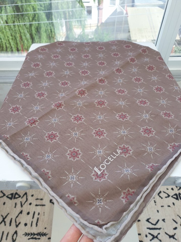 Yumuşak sentetik kumaştan yapılmış, dantel detaylı bej vintage kadın fular, pastel çiçek desenleriyle bohem ve retro tarzlara uygun.