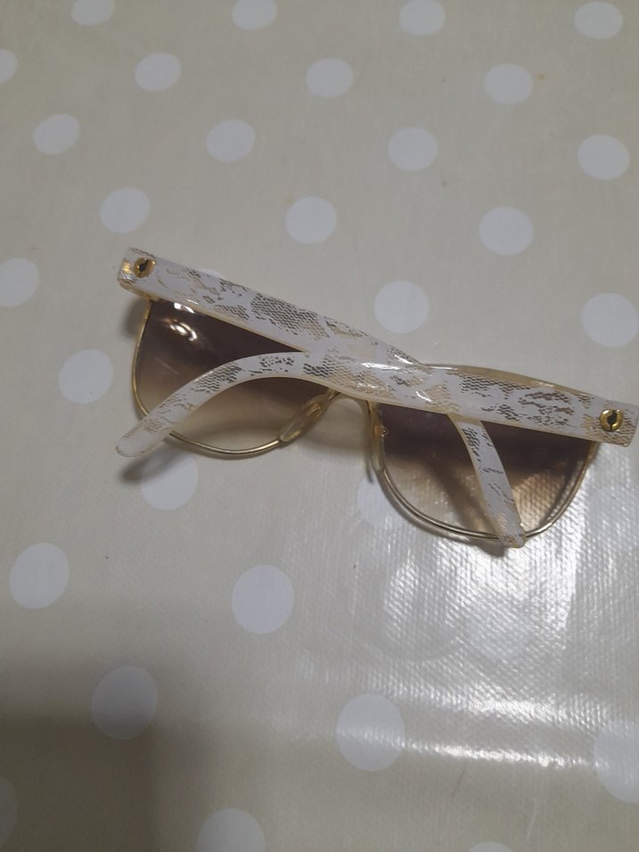 Parlak dantel detaylı bej vintage kadın güneş gözlüğü, bohem ve retro tarzı yansıtıyor. Hippie havası için uygun.