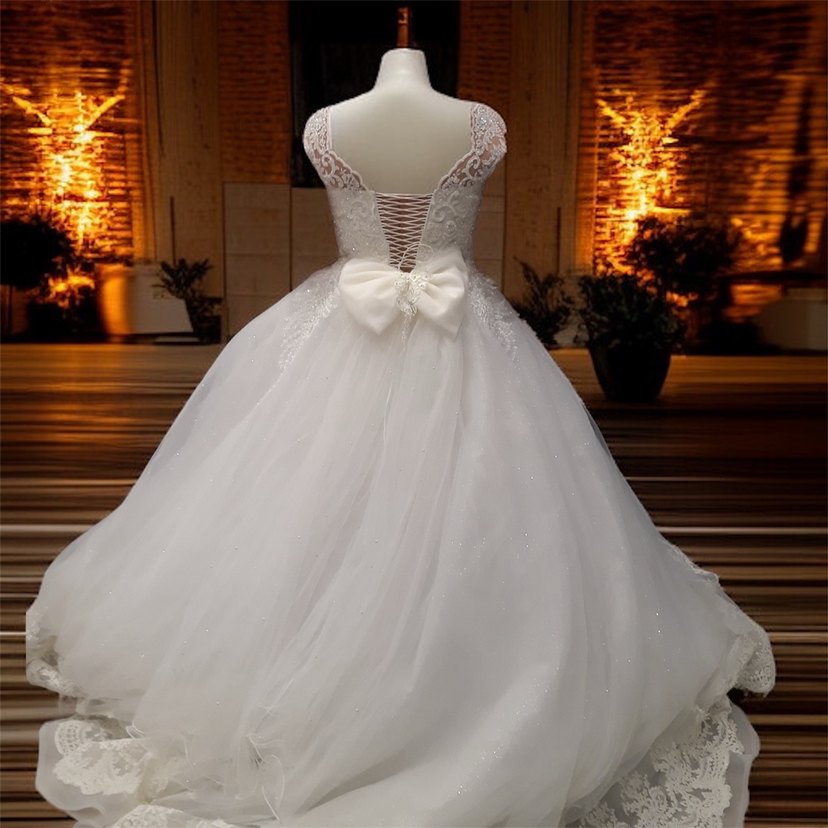 Dantel detaylı, sırt korseli ve beli büyük fiyonkla süslenmiş beyaz A kesim gelinlik, klasik ve göz alıcı bir şıklık sunar.