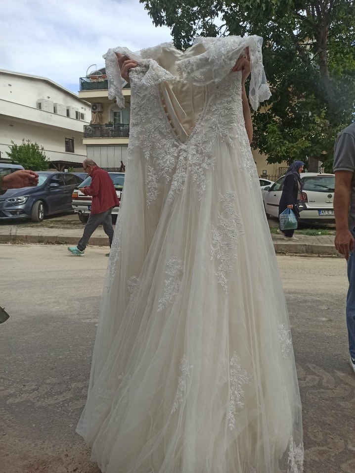 Dantel detaylı, askısız, uzun beyaz A-line gelinlik; vintage bohem tarzında, rahat kesimle klasik zarafet sunar.
