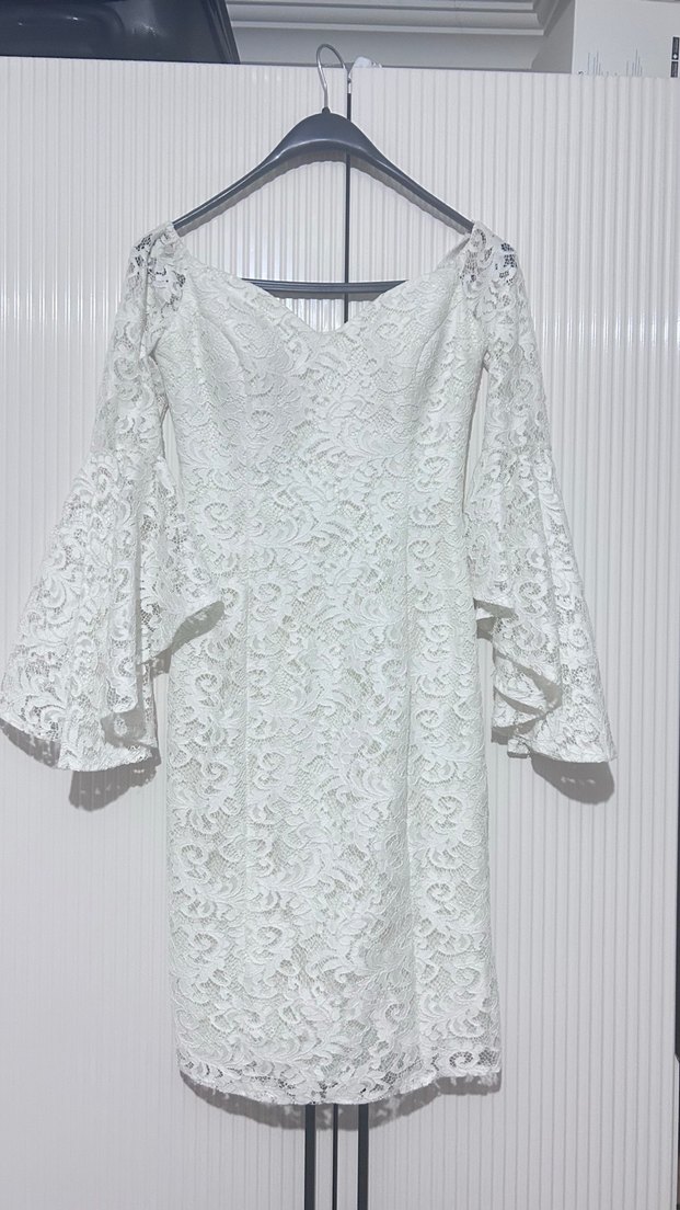 Dantel işlemeli, tekne yaka ve askılı kollu beyaz, vücuda oturan uzun abiye elbise. Bohem ve klasik Paris tarzını yansıtır. 1 kere nikahta giyildi tertemiz defosu yok 36 38 beden uyumlu