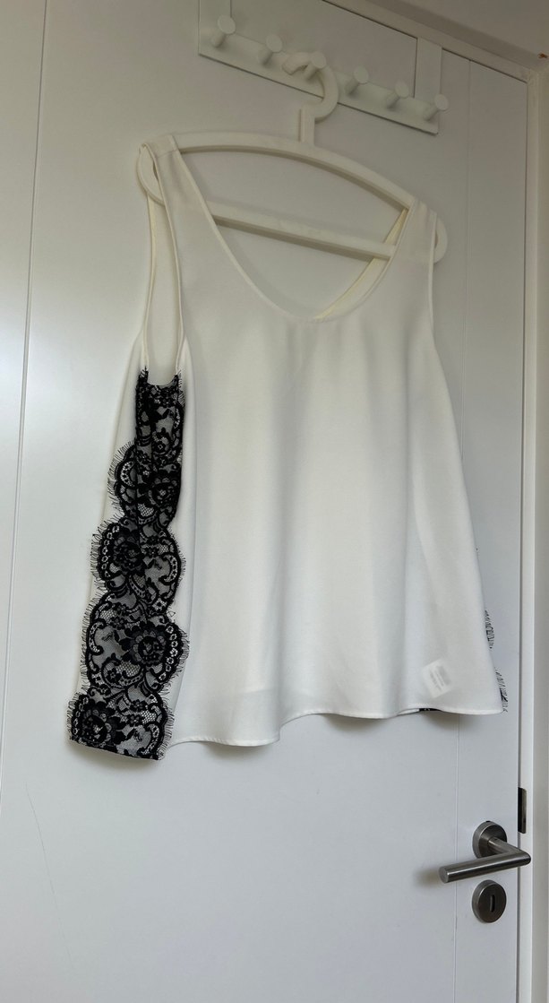 Tek omuz askılı, siyah dantel detaylı beyaz, askısız, bol kesim kadın bluz, gündelik sokak stili için uygundur.