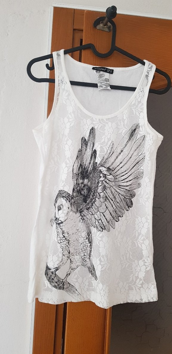 Beyaz pamuklu, dantel detaylı ve baskılı baykuş desenli, straplez, kolsuz, normal midi boyda, fitted kesim kadın atlet.