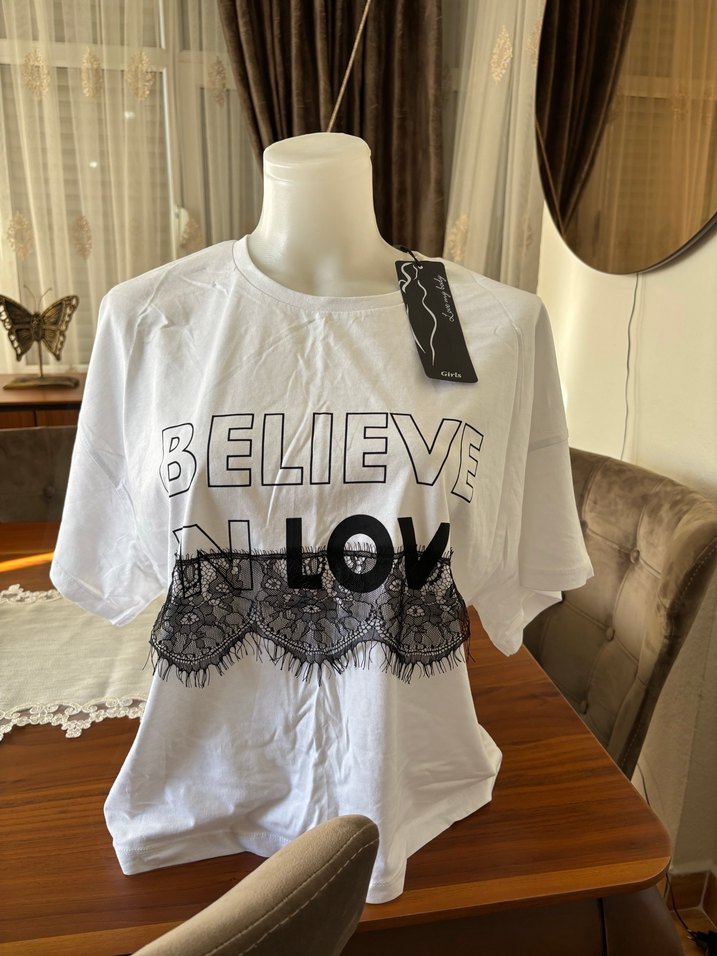 Pamuklu beyaz tişört, kısa kollu, yuvarlak yaka ve bol kesim. "BELIEVE" baskısı ve dantel detaylarıyla günlük kullanıma uygun.sıfır etiketli