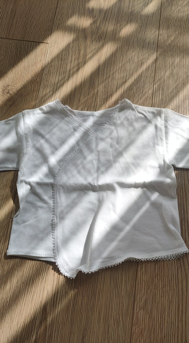 Yumuşak kumaşlı, dantel detaylı beyaz bebek içlik. Rahatlık sağlayan çapraz ön tasarıma sahiptir.