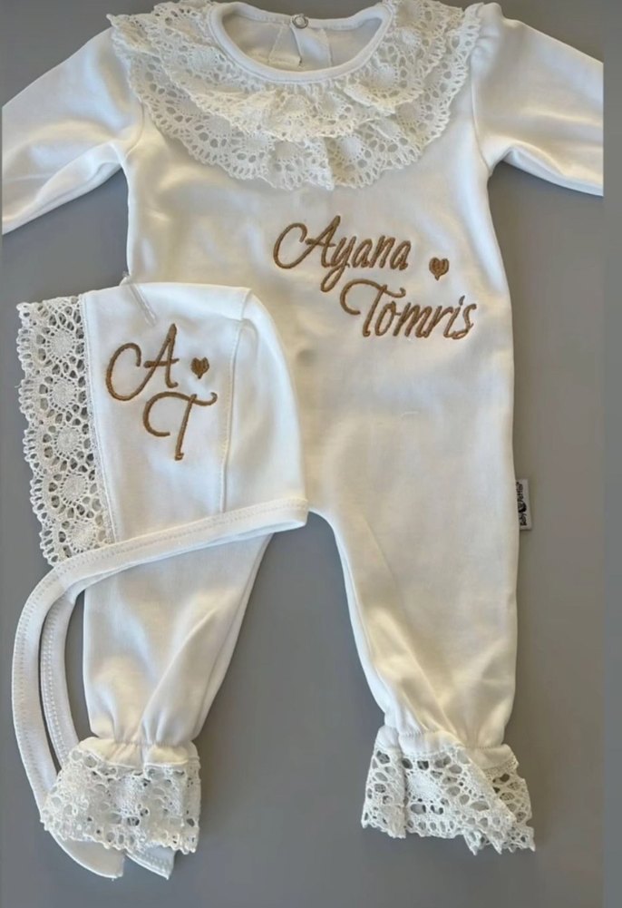 Dantel Detaylı Beyaz Bebek Kız Tulum isim nakışlı