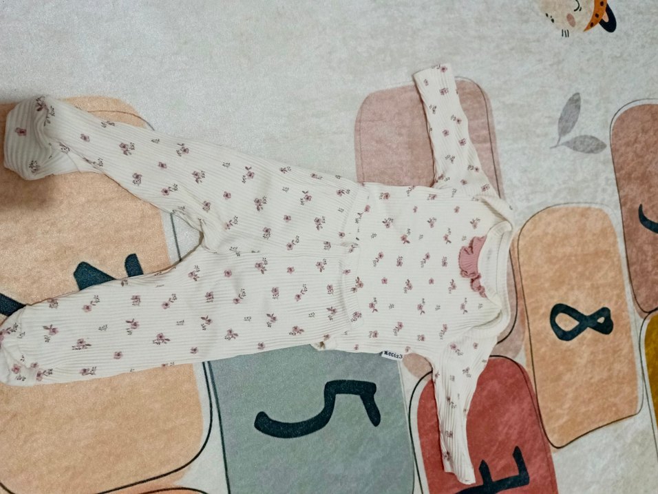 Pastel tonlarda, dantel detaylı beyaz bebek takım. Yumuşak kumaş, hafif çiçek desenli.