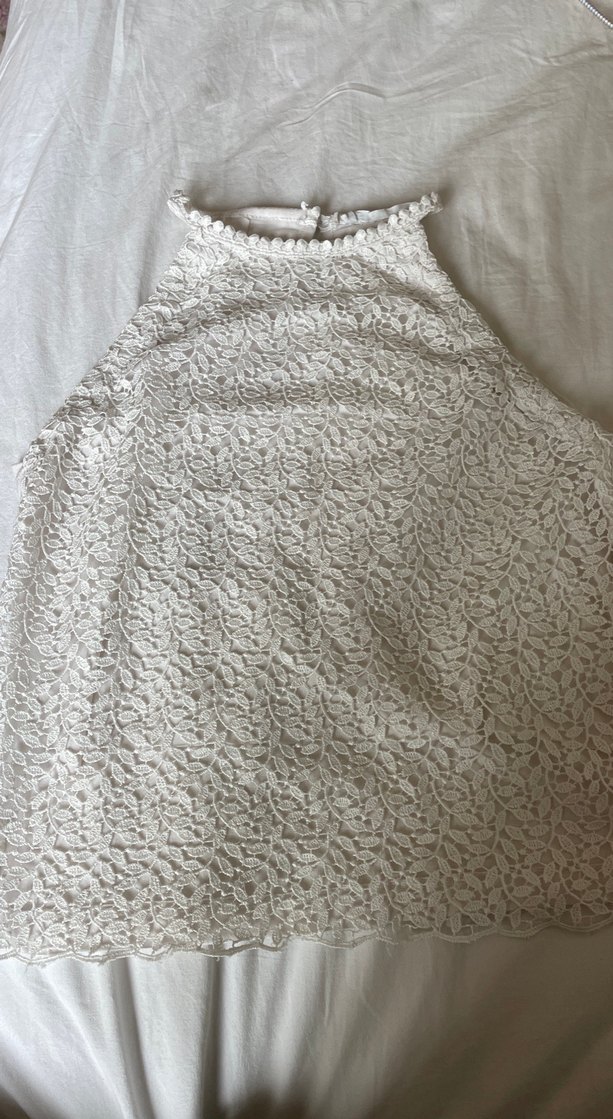 Dantel detaylı, kolsuz, tek renk beyaz bluz. Salaş kesim ve midi boyda, tekne yaka ile sade ve bohem tarzda.
