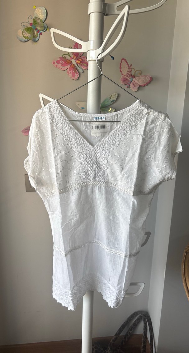 Pamuklu, dantel detaylı beyaz bluz. V yakalı, kısa kollu, bol kesim ve midi uzunlukta, bohem tarzıyla uyumlu.