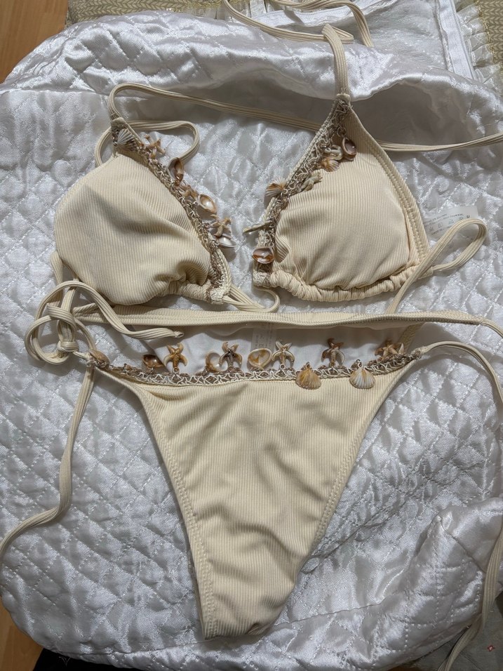 Dantel detaylı, ince askılı beyaz bikini takımı, işlemeli desenler ve deniz kabuklarıyla bohem tarzı yansıtıyor. temudan aldım ucuza koyuyorum hiç giymedim