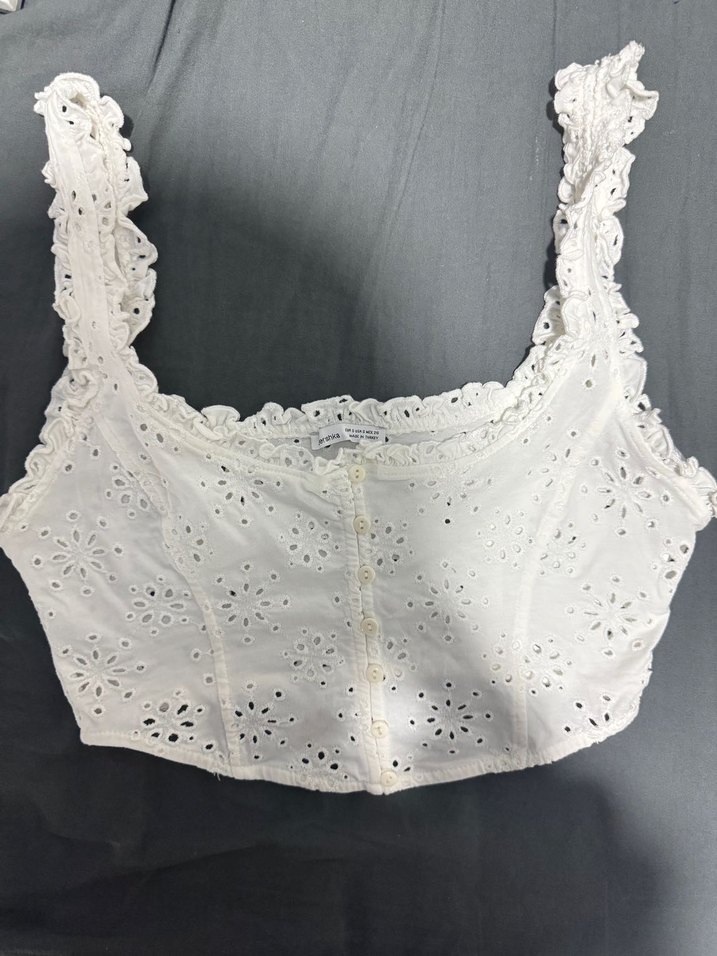Yumuşak pamuktan, nakışlı dantel detaylı, askılı ve tekne yakalı beyaz bustiyer. Bohem tarzda, normal uzunlukta ve vücuda oturan kesim.