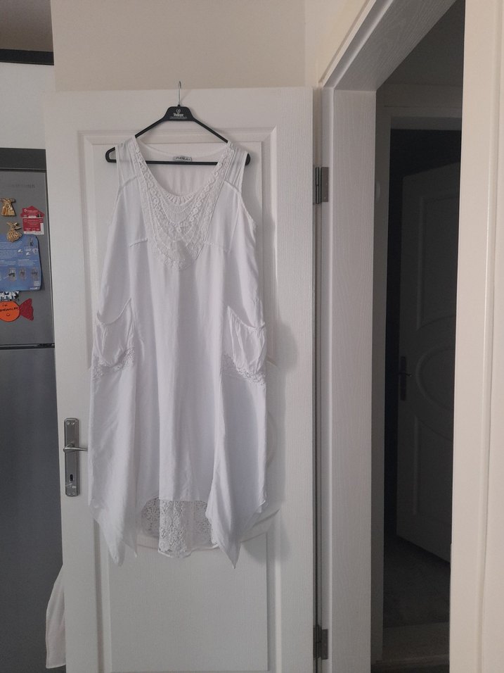 Dantel detaylı, V yakalı, beyaz keten kumaştan, bol kesim ve uzun boylu bohem tarzda elbise iki kol arası 53 cm boy 120 cm
