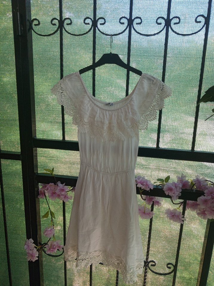 Beyaz bohem elbise, dantel detayları ve nakışlı desenle dikkat çeker. Askısız yakaya ve rahat kesime sahip, yumuşak keten kumaştan yapılmıştır.