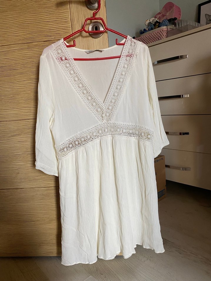 V yaka, dantel detaylı ve nakışlı desenlere sahip pamuklu, bol kesim beyaz elbise. Askılı kollu ve mini boyda, günlük kullanım için uygun. Eteğinin astarı bulunmaktadır.