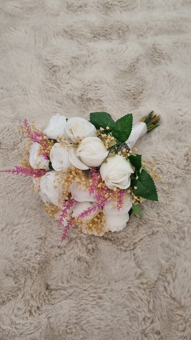 Dantel detaylı beyaz bohem gelin buketi, yumuşak beyaz güller ve hafif pembe vurgularla zarif bir görünüm sunar.