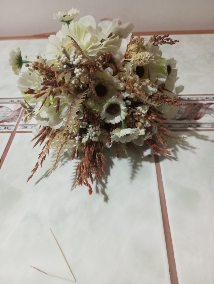 Dantel detaylı beyaz bohem gelin buketi, kuru ve taze çiçeklerin karışımından oluşur, hippie ve retro tarz için uygundur.