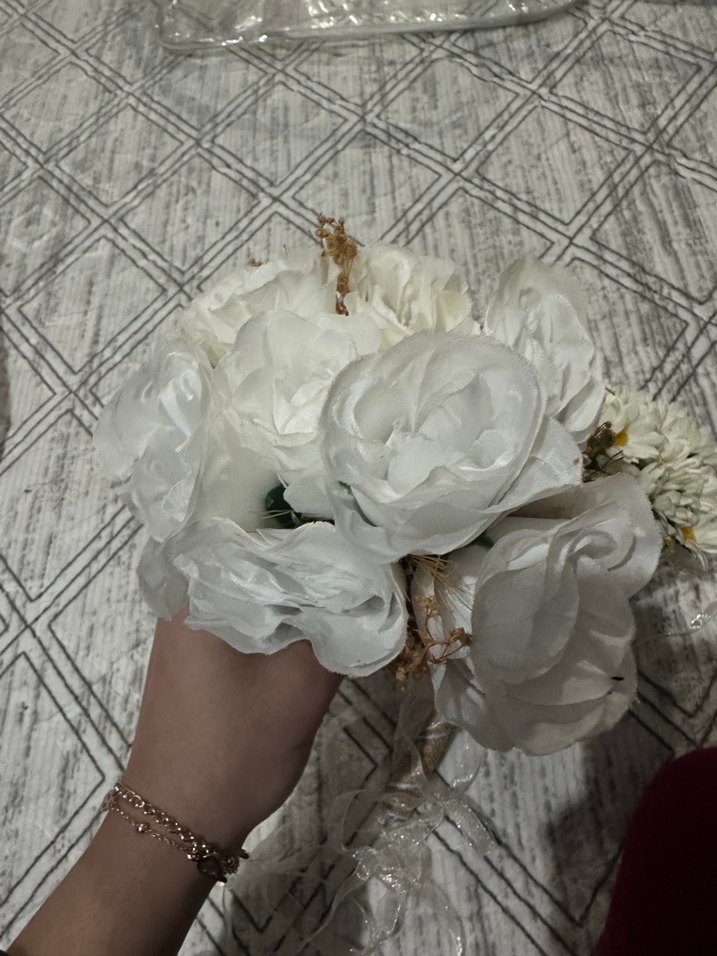 Dantel detaylı, beyaz bohem tarzda, yumuşak kumaş çiçeklerden oluşan gelin buketi. Retro ve hippie tarzlara uygundur.
