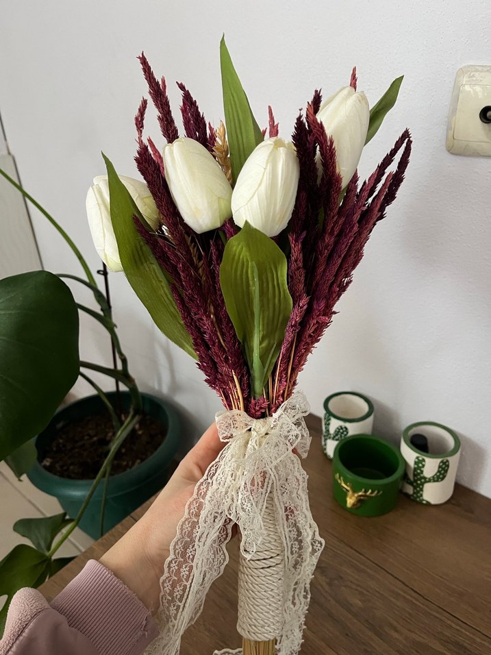 Beyaz lale çiçekler, bordo kurutulmuş yapraklar ve yeşil yapraklarla kombinlenmiş bohem tarzda gelin buketi, dantel kurdeleyle bağlanmıştır.