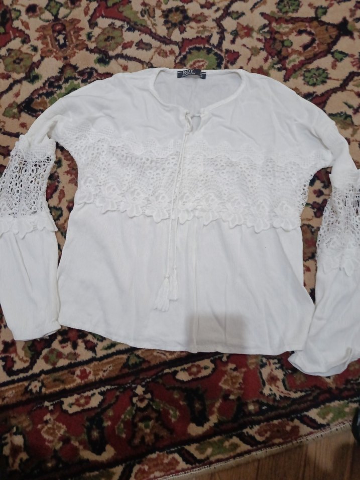Uzun kollu, pamuklu ve bol kesim beyaz kadın bluz. Dantel ve nakış detayları, yuvarlak yaka ve kısa boy ile bohem tarzını yansıtıyor.