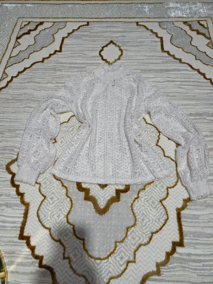 Koton Marka Beyaz örme kumaştan, dantel işlemeli, uzun kollu, yüksek yakalı, bol kesim, vintage bohem tarzda kadın bluz.