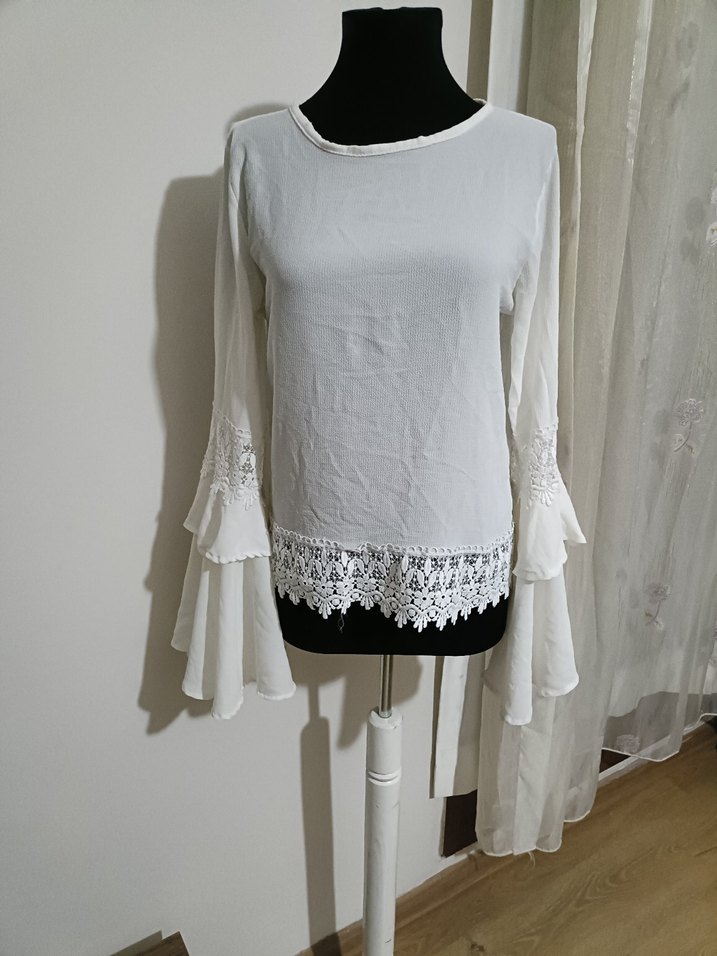 Pamuklu, uzun kollu beyaz bluz, manşetlerde ve etek ucunda dantel detaylıdır. Salaş kesim, yuvarlak yaka ve nakışlı desene sahiptir. Günlük kullanıma uygundur.