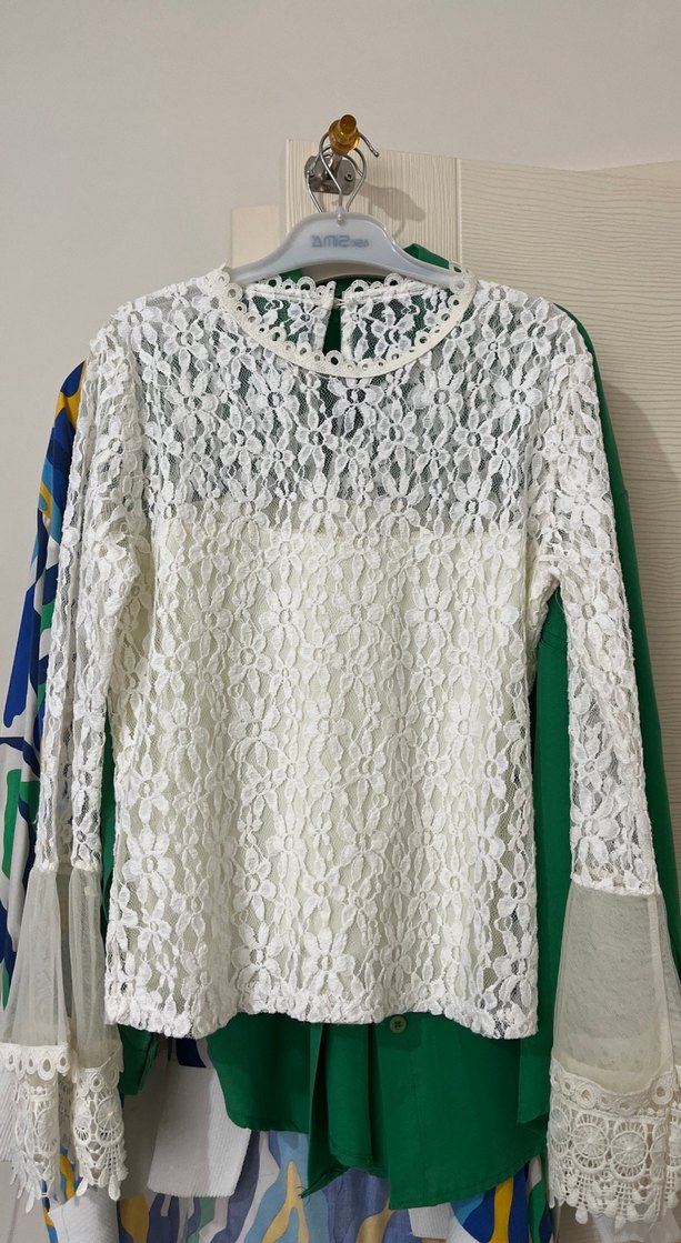 Uzun kollu, yuvarlak yaka beyaz bluz, yumuşak triko ve nakışlı dantel detaylıdır. Bol kesim ve normal boyda, bohem ve Paris tarzını yansıtır.