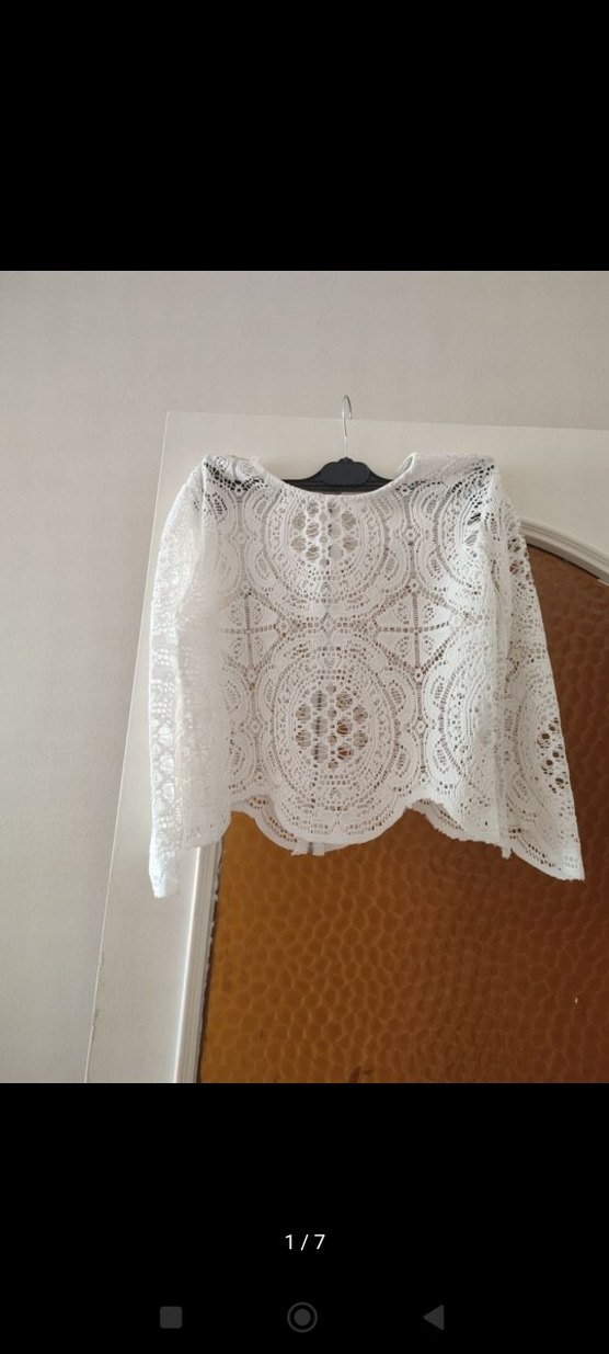 Dantel detaylı, yuvarlak yaka, uzun kollu, bol kesim beyaz bohem kadın bluz. Örgü kumaştan, nakışlı desenlere sahip. Günlük kullanım için uygundur.